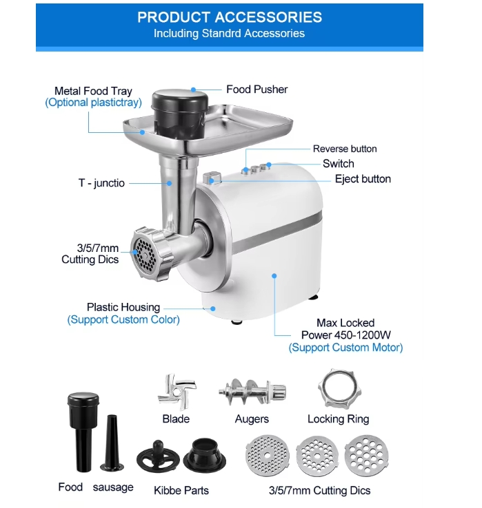 Номинальная мощность | 450-1200 Вт | Аксессуары | С толкателем для хранения продуктов, насадкой для куббе и колбасы, 3 режущих отверстия (тонкая, средняя, грубая) |