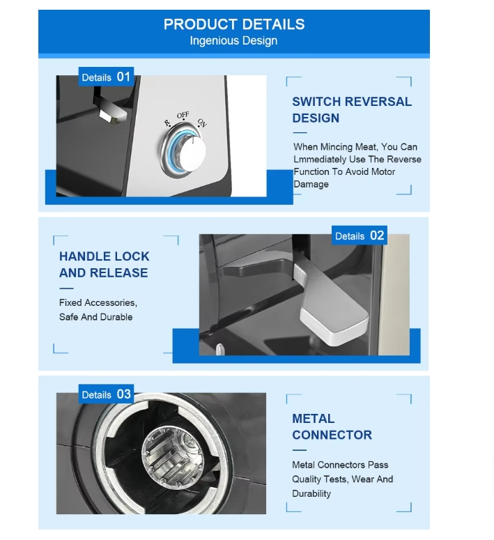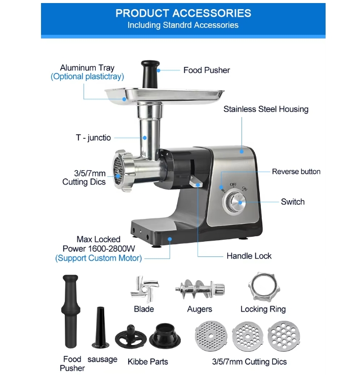 Электрические мясорубки обычно оснащаются различными типами мясорубок и аксессуарами, которые можно использовать для выполнения нескольких функций, таких как измельчение мяса, смешивание и откладка яиц.
